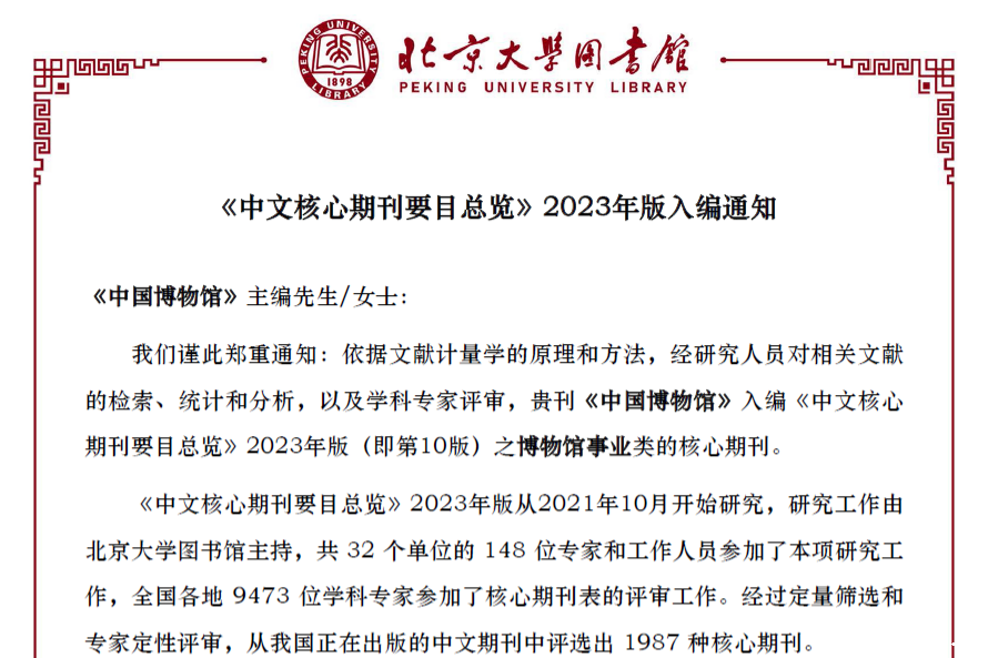 2023年12月26日,北京大学《中文核心期刊要目总览》2023年版编委会公布了《中文核心期刊要目总览》2023年版(第10版),18luck新利官网ios编辑出版的《中国博物馆》成功入选博物馆事业类核心期刊。