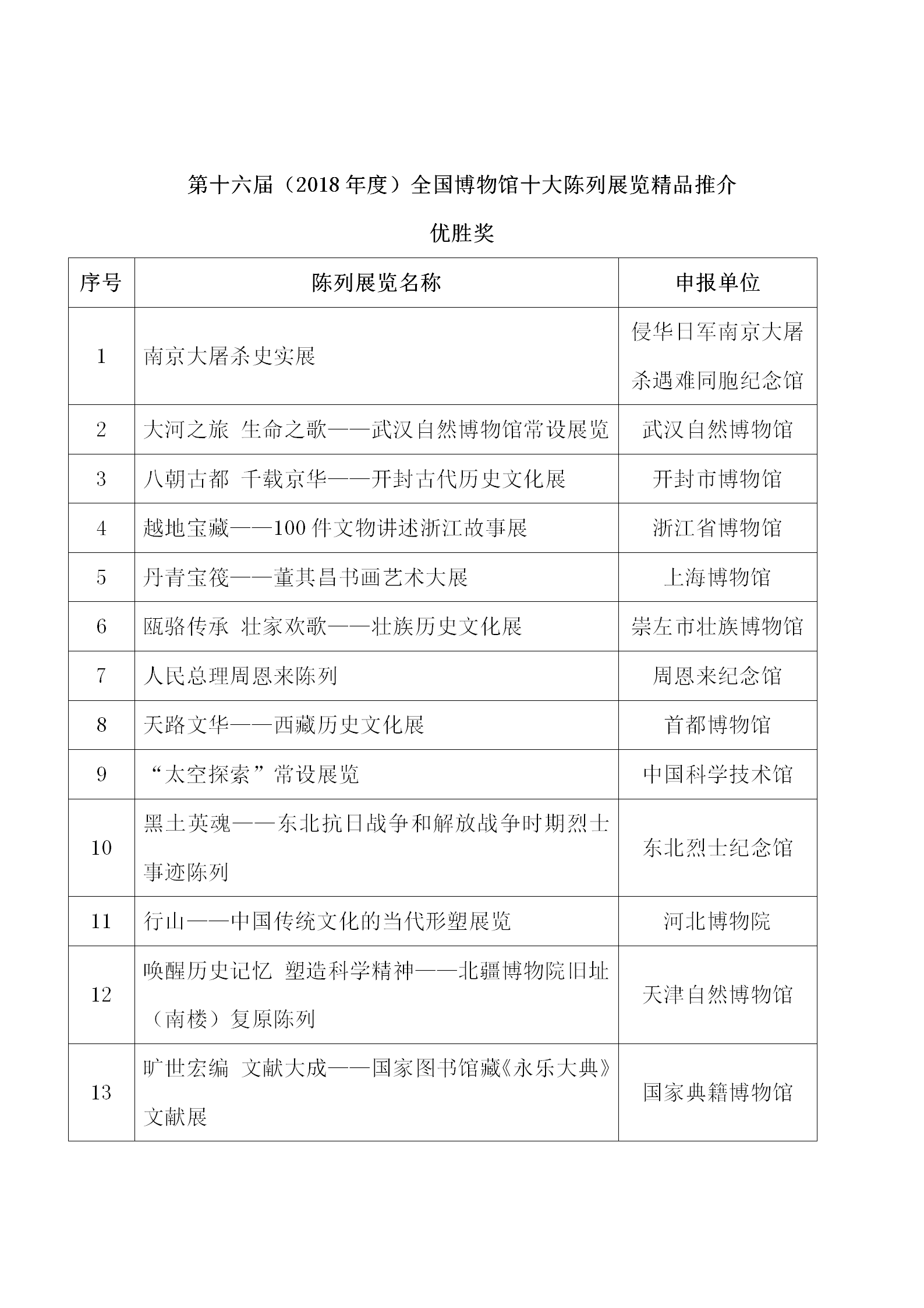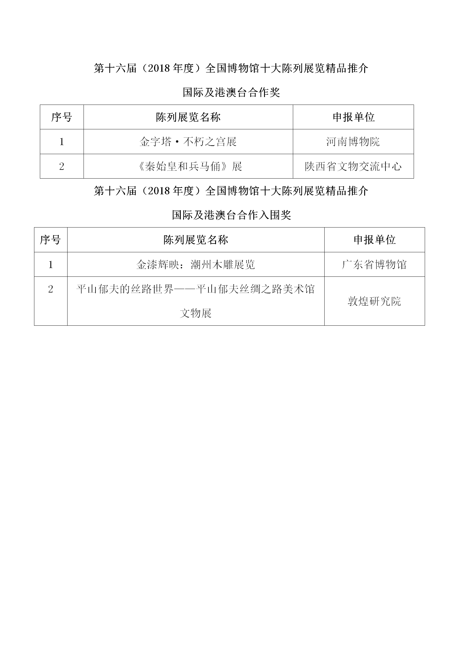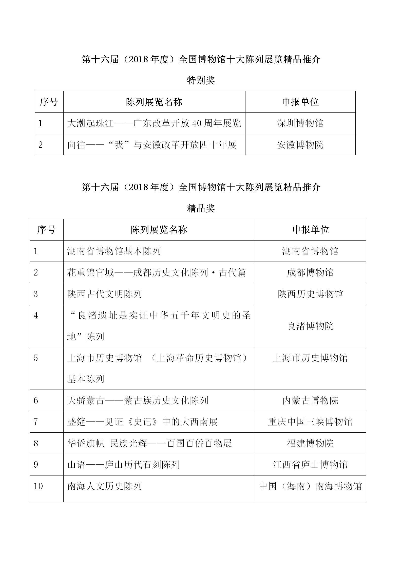 5月16日-17日,在29家入围终评的项目单位进行了演示汇报和经验交流后,15位专家组成的终评评委会根据《全国博物馆十大陈列展览精品推介办法》,在认真审核终评入围项目申报材料并听取项目汇报的基础上,评选产生第十六届(2018年度)全国博物馆十大陈列展览精品推介特别奖2项、精品奖10项、优胜奖13项,国际及港澳台合作奖和合作入围奖各2项。